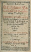 domestici mei Joannis Erbenij, Limburgensis AA.LL. Mgri. Not: Cas. publici, et Registratoris Elect. Moguntini: ac Annae Mariae, natae Stahlin vxoris mea: De Parentum nostrorum et proprio ortu nro, patria, domicialis, morte et sepultura eorundem: Item De consanguineis ac amicis utrisqu. ...ac digesti anno MDCLVI. Lateinische u. deutsche Handschrift auf Papier, 1656 Mit aquarell. Titelumrahmung, 5 (2 aquarellierte ganzseit.) Stammbäume, 1 eingeklebt. gest. Portrait u. 2 Federzeichn. im Text. 66 Bl., davon 44 Bl. beschrieben. Läd. Ldr. d. Zt.; einige Bll. zerstört (liegen in Bröseln bei), beiliegend ferner ein kleines Geheft mit Aufzeichnungen zur Familie, vf. vom Vater Nikolaus Erben. [...]