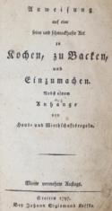 darinnen in einer Sammlung von mehr als dreyhundert Recepten, ... wie auch Pasteten, Tatres, Zucker-Confekt, Cremes, Früchte en Confitures,... vermehrt. Bern, Haller 1787. XV, 152 S. Interims-Kart. [...]