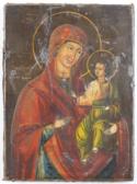 Die Ikone zeigt oben links den Heiligen Charalampius und rechts den Hl. Nikolaus, jeweils flankiert von Christus und Maria auf einer Wolke, sowie unten links die Hl. Ulita (Julita) mit ihrem Sohn Kyrik und rechts den Hl. Antipus. Die Bronze-Ikonen oben mittig mit der Gottesmutter Pokrow, emailliert. Links davon ein Triptychon mit dem Hl. Nikolaus, rechts ein Triptychon mit der Gottesmutter Trost aller Leidenden, darunter das Bronze-Triptychon einer Deesis und darunter ein weiteres Bronze-Triptychon mit dem Hl. Nikolaus. - Einige Abplatzungen. Bemalte Rückseite mit zahlr. Wurmlöchern u. einigen Sprüngen.