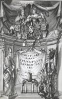 Scriptores rerum episcopatus Bambergenses. 2 in 1 Bd. Frankfurt u. Lpz. 1718. Fol. Mit gest. Titel, 2 gest. Titelvign., 2 gest. Kopfvign., 18 gest. Portraits u. 9 Kupfertafeln (1 gefalt.). 4 Bl., 15, 15 S., 1285 Sp., 30, 1 Bl., 8 S., 679 Sp., 17 Bl. Prgt. d. Zt. mit hs. Rtit. (Schwach fleckig, berieb. u. best.). - Spiegel gering beschäd., stellenweise gebräunt u. etw. fleckig.