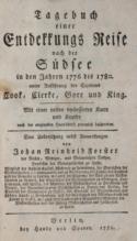 Engelmann 97. Nicht bei Sabin. - Erste Ausgabe des 1 Teils von Cooks dritter Weltreise. Band 6 der "Geschichte der See-Reisen und Entdeckungen im Süd-Meer". Der 2. Teil erschien in der gleichen Reihe in Bd. 7. Die Kupfertafeln mit Darstellung der Eingeborenen u. ihrer Kultur. - Vorliegendes Ex. enthält nur den Reihentitel. - Exlibris.