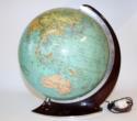Bearb. v. C. Luther. Berlin-Lichterfelde, ColumbusVerlag, um 1938. Tischglobus der Erde aus 12 farb. Segmenten u. 2 kl. Polkappen. Durchmesser ca. 26 cm. In Meridian-Halbring braunem Holzfuß gelagert, Gesamthöhe ca. 46 cm.