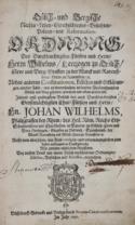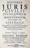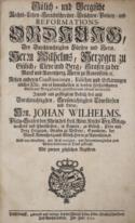 Rechts-Leben-Gerichtschreiber-Brüchten-Policey- und Reformation-Ordnung...Neben andren Constitutionen, Edicten und erklärungen etlicher Fälle, wie es derenthalben in beyden Fürstenthumben Gülich und Berg gehalten, geurtheilt und erkant werden soll...4 Tle. in 1 Bd. Düsseldorf, Schleuter 1696-97. Gr.4°. Mit ganzs. Kupf. (Stammbaum). 4 Bl. 185 S., 8 Bl.; 4 Bl., 101 S., 8 Bl.; 2 Bl., 46, 16, 15 S.; - Beigebunden: Ordnung des Hoch-Fürstl. Gülich- u. Bergischen Hoffgerichts zu Düsseldorff...Ebda. 1684. 2 Bl., 28, 24, 8 S. - Voets,M. Historia juris civilis Juliacensium et Montensium. Nunc secundum edita...Köln, Nöten 1683 (überklebt: Düsseldorff, Schleuter 1694). 3 Bl., 124 S., 4 Bl. - Ders. Tractatus de jure Revolutionis...Ed. secunda. Ebda. 1694. 3 Bl., 62 S., 3 Bl., 44 S., 2 Bl. Prgt. d. Zt. (Gebräunt, stärker fl., mehrere Kratzspuren, best.).