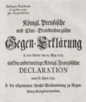 Nach KVK eine von mehreren Ausgaben mit versch. Kollat. - Etw. stockfleckig, hs. Num. a.T. - Dabei: Declaration Welche der Königl. Großbritannische und Chur-Fürstl. Hannöverische Comitial-Gesandte unterm Dato Regenspurg vom 22sten Septembr. 1756. bekannt machen lassen. O.O.u.Dr. 1756. Kl.4°. 2 Bl. Ohne Einband, ausgebunden. - Ausgabe in dt. Sprache (es ersch. auch eine Paralleltext-Ausg. dt.-franz.). Eine von mindestens vier Druckvarianten mit versch. Schreibweisen Großbrit(t)an(n)ische im Titel. - Etw. stockfleckig, hs. Num. a.T. - Hellen,(B.)v. Memoire Des Königl. Preußischen Ministers im Haag, Herrn von Hellen, an Jhro Hochmögenden auf dasjenige, so der Königl. und Chur-Sächsische Minister den 29sten September übergeben hat. O.O., Dr.u.J. (1756). Kl.4°. 2 Bl. - Angebunden: (Reizer,J.G.) Verfolg der Reichshofrathlichen Conclusorum Sabbathi, d. 9. Oct. 1756. Den gewaltsamen Königl. Preußischen, Chur-Brandenburgischen Einfall in die Königl. Pohln. Chur-Sächsischen Chur-Lande, auch weitern Anzug in die Reichs-Lande betreffend. O.O.u.Dr. 1756. 2 Bl. Ohne Einband, ausgebunden. - I. VD 18, 90581695. Nach KVK eine von mindestens zwei Druckvarianten. - Tls. leicht fleckig, hs. Num. a.T. - Gegründete Nachricht von dem Auszuge der Königl. Pohln. und Churfürstl. Sächß. Armee aus ihrem Lager bey Pirna. Drsdn., o.Dr. 1756. Kl.4°. 20 S. Ohne Einband, ausgebunden. - VD 18, 10578323-004. - Leicht fleckig, hs. Num. a.T.